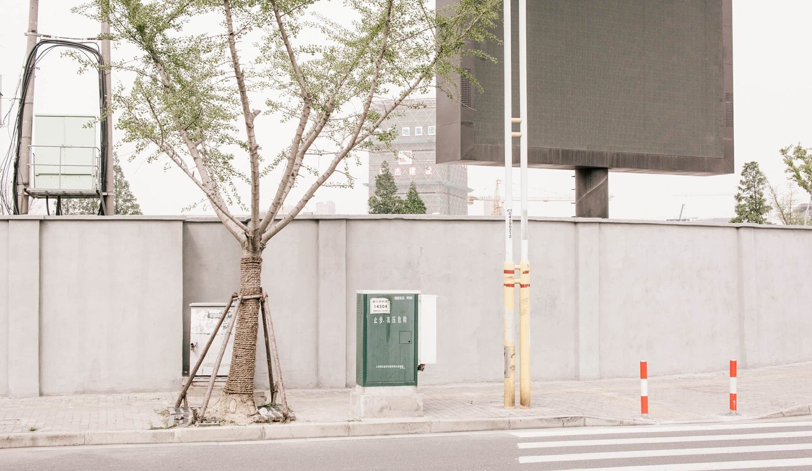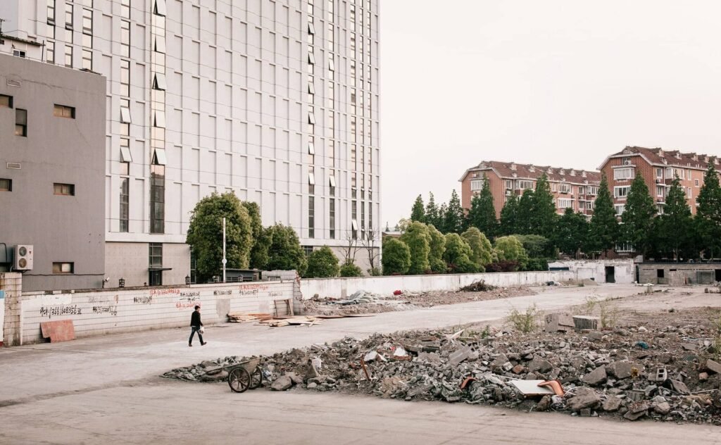 A small, solitary figure in dark clothing carries a bouquet of flowers carelessly in his right hand as he walks obliquely away from the viewer, making his way along one side of the site of a recently-demolished building. To his left, a modern office tower rises from behind a concrete wall that is marked with spray-painted ten- and eleven-digit numbers. Between the office building and the wall rises an inconsistent row of trees, two of them apparently dead. It is unapparent where the man is going. It is unapparent where he even could be going.